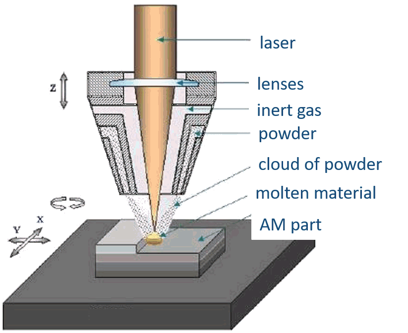 Directed energy deposition (DED) - AM process in which focused thermal energy is used to fuse materials by melting as they are being deposited
