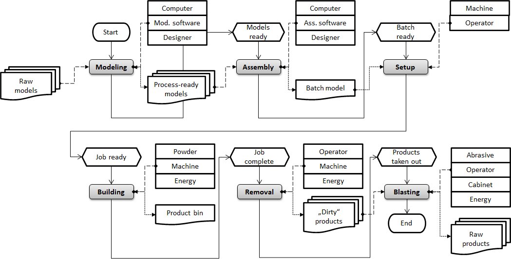 The activity-based PBF production model for manufacturing of polymer products described in the section "Costs of PBF technologies" is presented in the following picture: