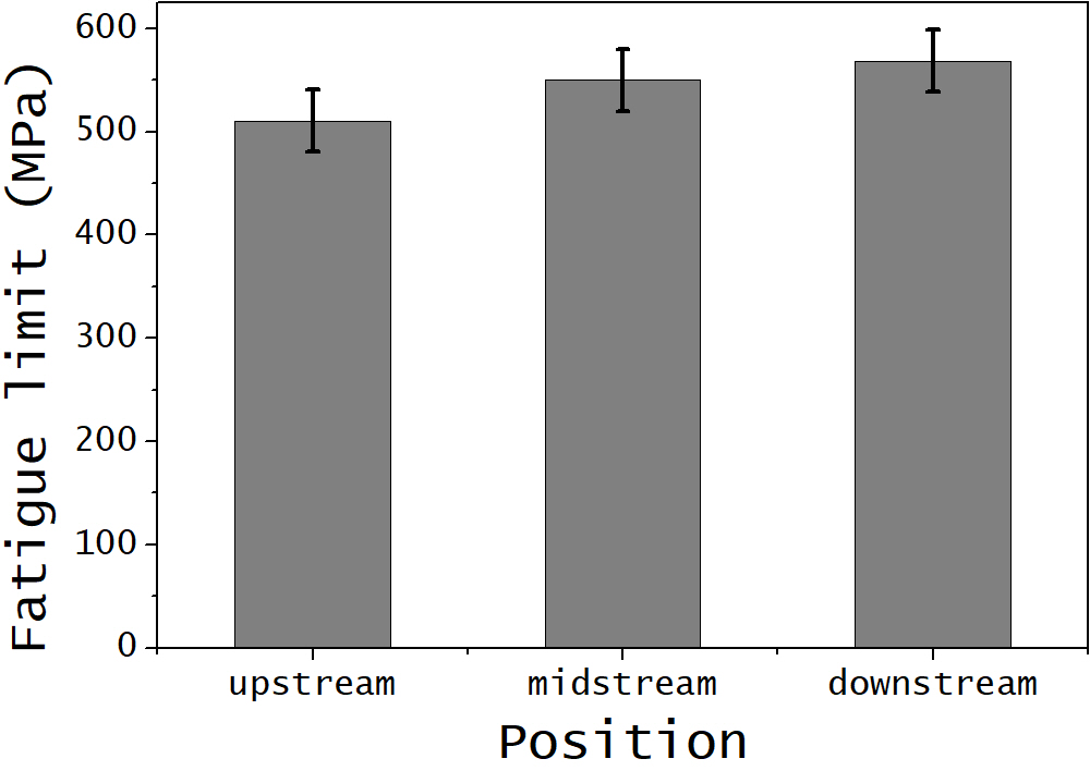 The comparison of the fatigue performances in the infinite life domain of samples manufactured in different positions in production chamber is presented in the following figure, which also suggests that the fatigue performance in the finite life domain of the samples in downstream positions (right bar) is higher than the fatigue performance of the samples in midstream (middle bar) and upstream (right bar) positions.