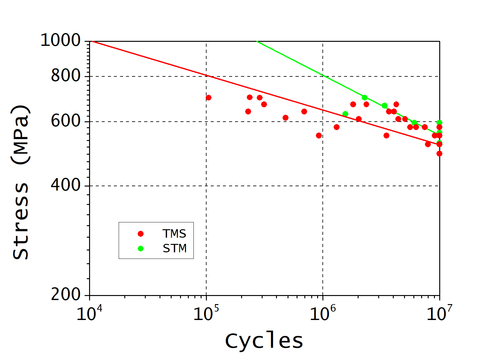 The following figures and tables present the results of the studies of the influence of the order of post-processing procedures of samples to fatigue performance in finite life domain and fatigue limit of maraging steel MS1, stainless steel PH1 and maraging stainless steel CX obtained during the A_MADAM project. The outline of the tables follows the notation and conventions described at the page Fatigue design rules for DMLS/SLM products. The orders of prost-processing procedures applied to the samples are denoted in figures by abbreviations “SM” (without heat-treatment, shot-peening before machining), “MS” (without heat-treatment, shot-peening after machining), “SMT” (the usual shot-peening/heat-treatment/machining post-processing sequence) and “TMS” (the studied heat-treatment/machining/shot-peening post-processing sequence).