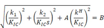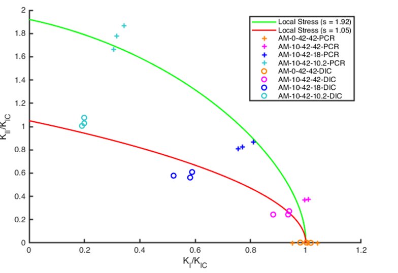 The following figure illustrates the applicability of the criterion, with the red line (s=1.05, KIIC=46.9MPa·m-1/2) being fit to data obtained the Critical Fracture Load (PCR) method (empty circles), and green line (s=1.95, KIIC=87.2MPa·m−1/2) fit to data obtained by Fitting of the displacement field obtained by DIC (full circles).
