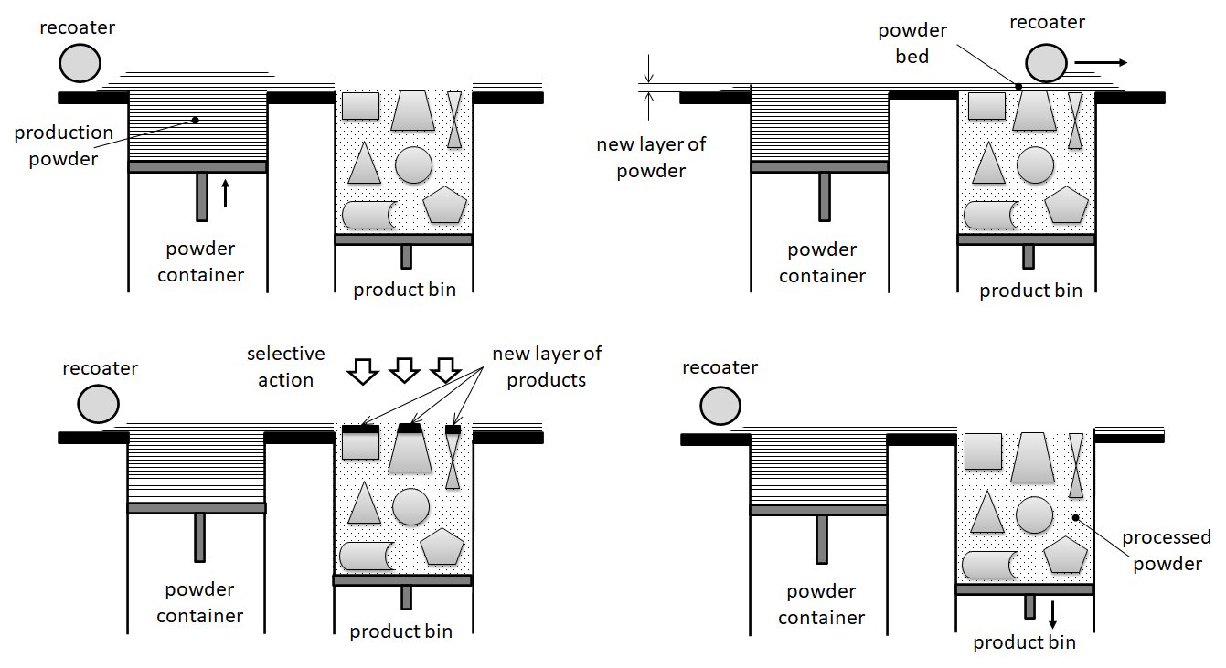 The production process of each AM technology consists of a sequence of cycles for production of individual horizontal layers of products. With PBF technologies, each of the layers is manufactured by joining particles of a thin layer of a powder. The production cycle of a PBF technology starts with addition of a small amount of the production powder mixture to the production chamber (top left image in the figure above). The image shows that the addition is achieved by rising of the movable bottom of the powder container, but other solutions exist as well. Using a recoater with horizontal motion, the added production powder is then distributed uniformly over the surface of the production chamber (top right image in the figure above), thus forming a thin layer of the production powder that covers the area where the products are built, which is called the powder bed. The areas of powder bed that belong to cross-sections of the products are then exposed to selective action of an intensive, but short, heat pulse that causes melting of the powder. After the heating stops, the melted material rapidly cools and solidifies (bottom left image in the figure above) into a new layer that joins to the previously manufactured layers of the products. After the manufacturing of a layer of products, the bottom of the production bin, which contains the products and the powder which was not exposed to the selective action during the process, is lowered, so that the top of the production bin may be covered by the powder added for manufacturing of the next layer of products in the following production cycle.