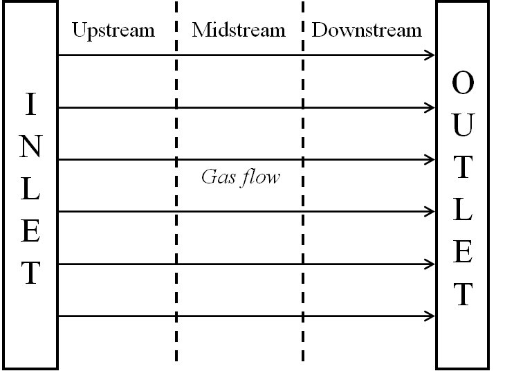 In the following text, the position of a product in the production chamber with respect to the inert gas flow (used to remove the burnt particles created during the laser sintering process) is classified as upstream, midstream or downstream (as explained in the figure below). Due to their mass, the inert gas flow cannot remove all the burnt particles from the production chamber. Since the burnt particles may be incorporated into a manufactured sample and act as material defects and sources of initial cracks, the products manufactured in different positions along the path of the gas flow may have different fatigue performances.