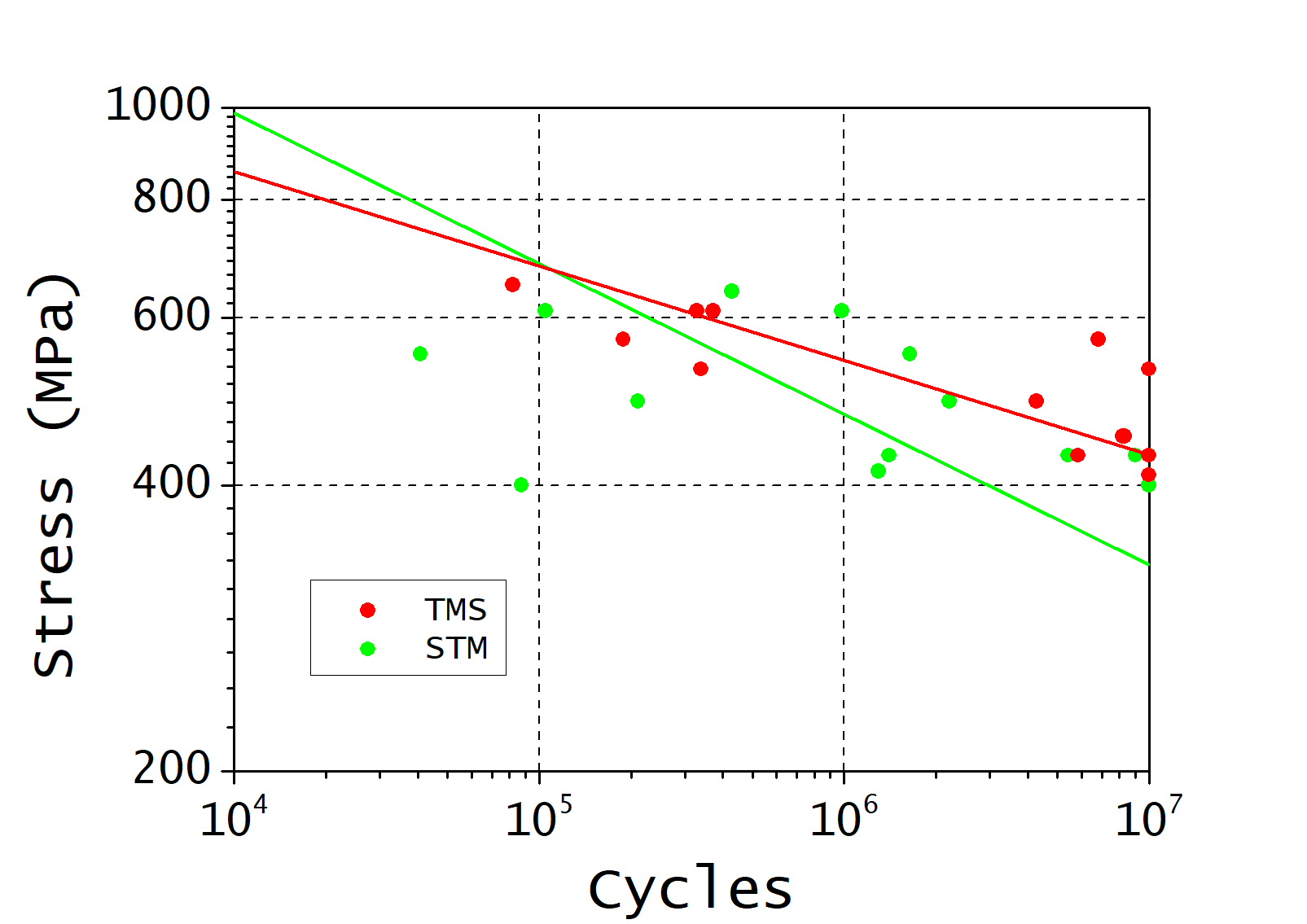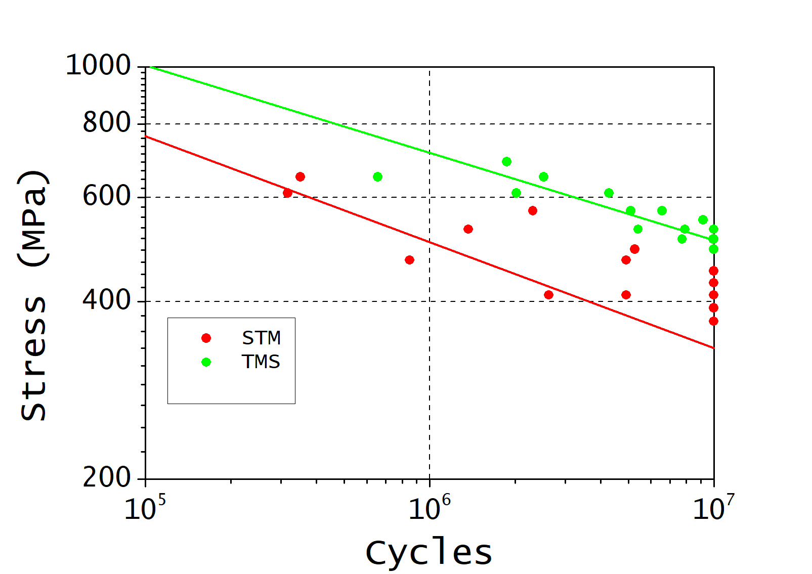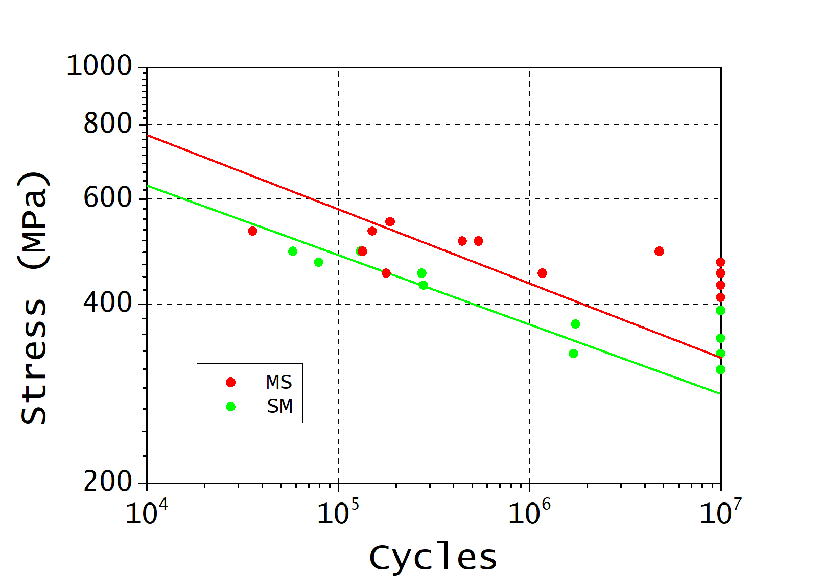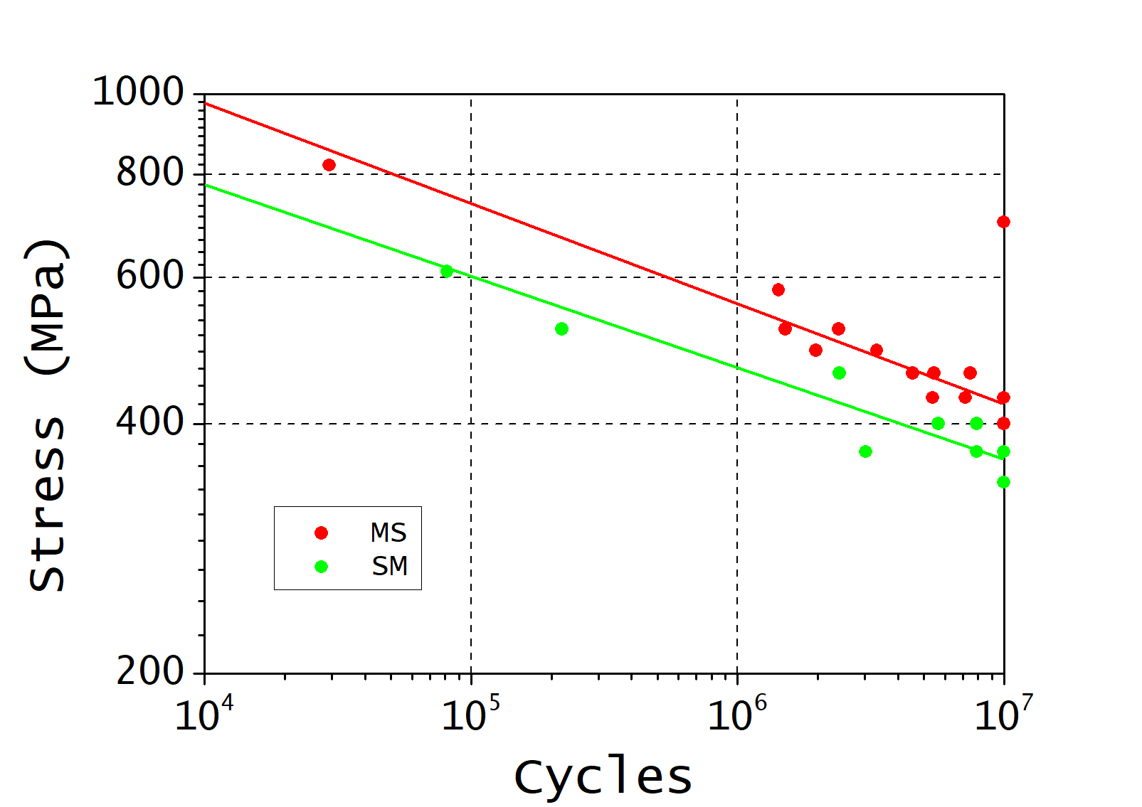 The following figures and tables present the results of the studies of the influence of the order of post-processing procedures of samples to fatigue performance in finite life domain and fatigue limit of maraging steel MS1, stainless steel PH1 and maraging stainless steel CX obtained during the A_MADAM project. The outline of the tables follows the notation and conventions described at the page Fatigue design rules for DMLS/SLM products. The orders of prost-processing procedures applied to the samples are denoted in figures by abbreviations “SM” (without heat-treatment, shot-peening before machining), “MS” (without heat-treatment, shot-peening after machining), “SMT” (the usual shot-peening/heat-treatment/machining post-processing sequence) and “TMS” (the studied heat-treatment/machining/shot-peening post-processing sequence).