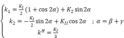 | α (deg) | S1 (mm) | S2 (mm) | KI (MPa·m-1/2) | KII (MPa·m-1/2) | KI (MPa·m-1/2) | KII (MPa·m-1/2) |